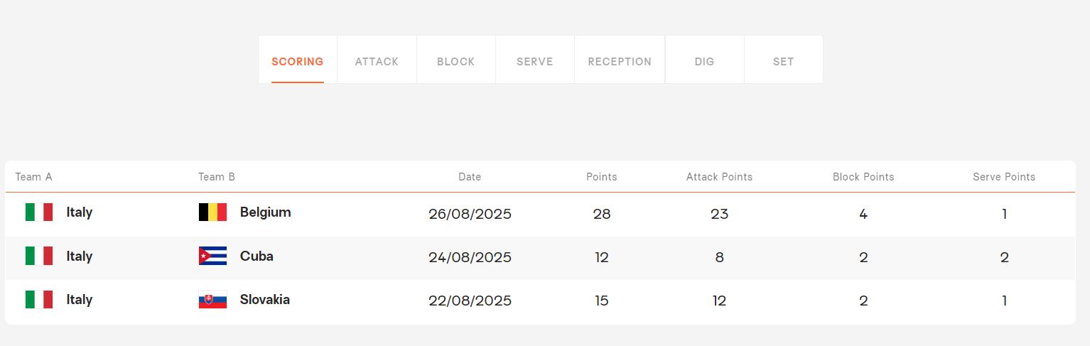 北京时间8月26日,2025年女排世锦赛,意大利女排3-1击败比利时女排豪取三连胜,意大利女排轻松的锁定了B组第一,四局比分:25-16、25-16、21-25、 25-18。这场比赛意大利女排有三人得分上双,比利时女排只有两人得分上双。